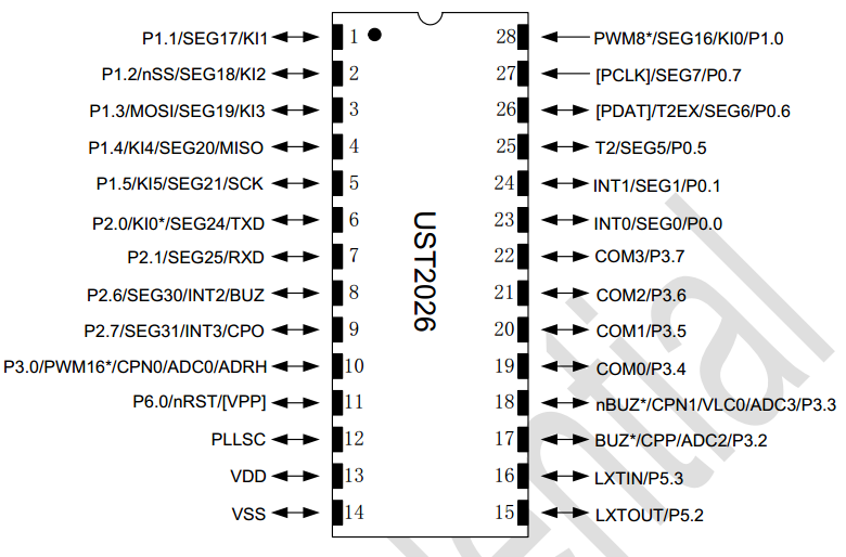 UST2026 is a 8-bit MCU based on enhanced 51 core. It integrated 6+2-Ch/12bit-ADC and 128-seg LCD, embeds16K-byte OTP and 512-byte RAM, also PLL, RTC, UART, Comparator and Timers/Counters.