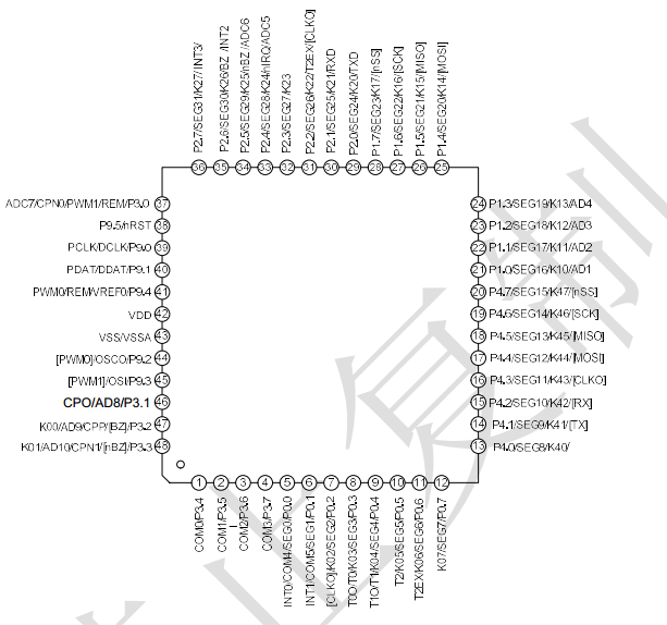 ² 內(nèi)置電阻型 LCD 驅(qū)動器,電阻型 LCD 對比度 8 級可調(diào),3 種驅(qū)動能力可選,具有快速充電模式;最大支持 4X35 段,5X34 段,6X33 段;1/2、1/3 偏置可選。